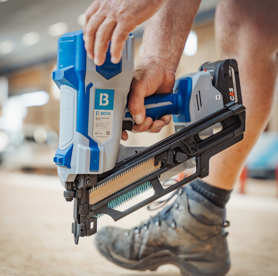 Für den Anfang steigt Beck Fastening mit drei Geräten in die CAS-Akku-Welt ein: dem Beck Akku Stauchkopfnagler 55 mm, dem Beck Akku Klammergerät 40 mm und dem Beck Akku Streifennagler 33°, 90 mm. Christian Beck erläutert: „Unsere Endkunden sind Fachbetriebe im Bereich Holz- und Fensterbau, im Innenausbau und Holzhandwerk allgemein. Sie arbeiten auf den Baustellen natürlich auch mit weiteren Elektrowerkzeugen, wie Sägen, Akkuschraubern, Akkubohrern, Fräsen oder Saugern, und brauchen professionelle Baustellenbeleuchtung. Künftig können auch unsere Kunden den großen Pool an Synergien nutzen, den das CAS-Partnernetzwerk bietet.“