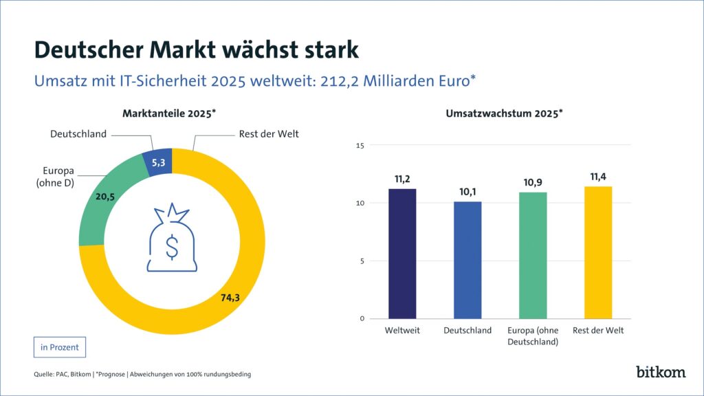 Am stärksten steigen im laufenden Jahr die Ausgaben für Sicherheitssoftware und entsprechende Cloud-Plattformen, die um 12,1 Prozent auf 4,8 Milliarden Euro zulegen. Die Aufwendungen für Dienstleistungen rund um IT-Sicherheit wachsen um 9,7 Prozent auf 5,6 Milliarden Euro. Nur geringfügig um 1,4 Prozent auf 800 Millionen Euro ist das Plus bei IT-Sicherheits-Hardware. Der deutsche Gesamtmarkt für IT-Sicherheit legt 2025 um starke 10,1 Prozent zu, andere Länder wachsen aber schneller. So verzeichnet der weltweite Markt für IT-Sicherheit 2025 ein Wachstum um voraussichtlich 11,2 Prozent auf 212,2 Milliarden Euro. Auch die anderen europäischen Länder steigern ihre Ausgaben durchschnittlich um 10,9 Prozent, der Rest der Welt sogar um 11,4 Prozent. Aktuell beträgt der deutsche Marktanteil am globalen IT-Sicherheitsmarkt 5,3 Prozent. Das restliche Europa kommt auf 20,5 Prozent. „Die große Nachfrage nach gleichermaßen leistungsstarken wie vertrauenswürdigen Sicherheitslösungen bietet enorme Chancen für deutsche Anbieter“, so Wintergerst. „Die it-sa zeigt: Cybersicherheit darf nicht allein als Kostenfaktor verstanden werden, sie garantiert Zukunft und ermöglicht Wertschöpfung, Vertrauen und Innovation in Deutschland.“