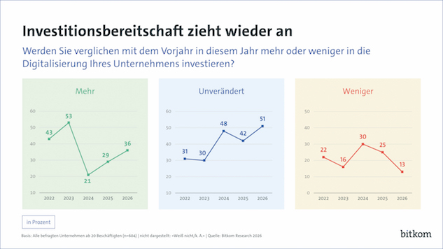 Die Bereitschaft der Unternehmen, in Digitalisierung zu investieren, zieht 2026 trotz schwieriger wirtschaftlicher Rahmenbedingungen an. 36 Prozent wollen in diesem Jahr mehr investieren als im Vorjahr, 2025 lag der Anteil bei 29 Prozent, 2024 sogar nur bei 21 Prozent. Umgekehrt wollen nur 13 Prozent ihre Investitionen zurückfahren, nach 25 Prozent 2025 und 30 Prozent 2024. 51 Prozent wollen in diesem Jahr ihr Investitionsniveau halten.