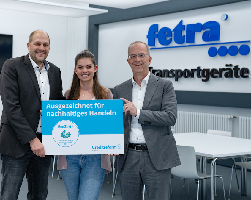 Auch in diesem Jahr darf sich die Fetra – Fechtel Transportgeräte GmbH über eine besondere Auszeichnung freuen: Das Unternehmen erhielt erneut das EcoZert-Zertifikat für herausragende Nachhaltigkeit. Die Übergabe erfolgte bei Fetra, vor Ort. Udo Roggenbuck, Prokurist Creditreform Bielefeld, überreichte das Zertifikat an die Nachhaltigkeitsbeauftragte Maja Schröer und den Marketingleiter Jan Völlering.