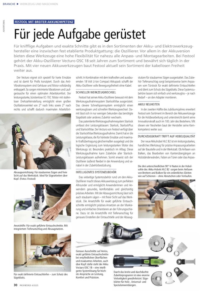 Für knifflige Aufgaben und exakte Schnitte gibt es in den Sortimenten der Akku- und Elektrowerkzeughersteller eine inzwischen fest etablierte Produktgattung: die Oszillierer. Vor allem in der Akkuversion bieten diese Werkzeuge eine hohe Flexibilität für nahezu alle Anpass- und Montagearbeiten. Bei Festool gehört der Akku-Oszillierer Vecturo OSC 18 seit Jahren zum Sortiment und bewährt sich täglich in der Praxis. Mit vier neuen Akkuwerkzeugen baut Festool aktuell sein Sortiment der kabellosen Freiheit weiter aus.