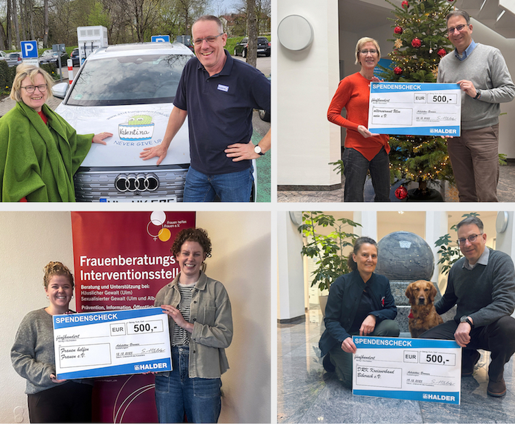Mit 500 Euro fördert Halder die Selbsthilfegruppe Depression in Laupheim. Die Stadtkapelle Laupheim erhielt 350 Euro zur Unterstützung eines besonderen Gemeinschaftskonzerts im Kulturhaus Laupheim. Mit 1.750 Euro geht der größte Teil der Spendensumme – wie bereits im Vorjahr – an den Martinusladen der katholischen Kirchengemeinde Sankt Petrus und Paulus Laupheim. Der Tafelladen versorgt Menschen mit geringem Einkommen mit Lebensmitteln und Dingen des täglichen Bedarfs. Weitere 1.000 Euro erhält das Seniorenzentrum Laupheim / Hospital zum Heiligen Geist. Die Einrichtung bietet das gesamte Spektrum der Altenhilfe – von ambulanter Versorgung über Tagespflege bis hin zu stationärer Betreuung und betreutem Wohnen.