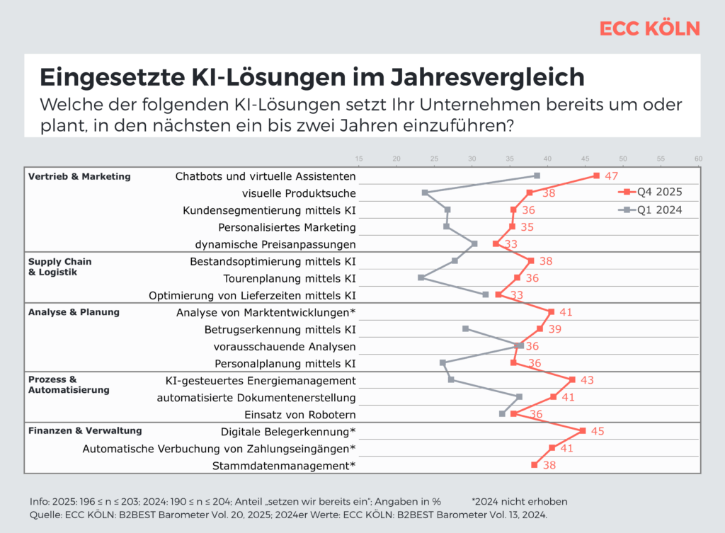 Im Vergleich zu Anfang 2024 hat der Einsatz von KI deutlich Fahrt aufgenommen: Vor allem größere B2B-Unternehmen integrieren die Technologie inzwischen in zahlreiche Geschäftsbereiche. Besonders häufig kommen KI-Lösungen in der IT-Sicherheit (75 %, 2024: 72 %) und im IT-Betrieb (75 %) zum Einsatz. Auch im Vertrieb (72 %, 2024: 59 %) sowie im Kundenservice (71 %, 2024: 66 %) ist ein klarer Anstieg zu verzeichnen. Zu den meistgenutzten Lösungen zählen Chatbots und virtuelle Assistenten (47 %), gefolgt von digitaler Belegerkennung (45 %) und KI-gesteuertem Energiemanagement (43 %). Für das kommende Jahr planen knapp drei Viertel der Befragten (74 %), ihre Investitionen in KI zu steigern.