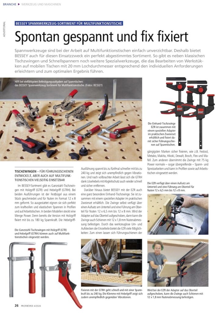 Spannwerkzeuge sind bei der Arbeit auf Multifunktionstischen einfach unverzichtbar. Deshalb bietet BESSEY auch für diesen Einsatzzweck ein perfekt abgestimmtes Sortiment. So gibt es neben klassischen Tischzwingen und Schnellspannern noch weitere Spezialwerkzeuge, die das Bearbeiten von Werkstücken auf mobilen Tischen mit 20 mm Lochdurchmesser entsprechend den individuellen Anforderungen erleichtern und zum optimalen Ergebnis führen.